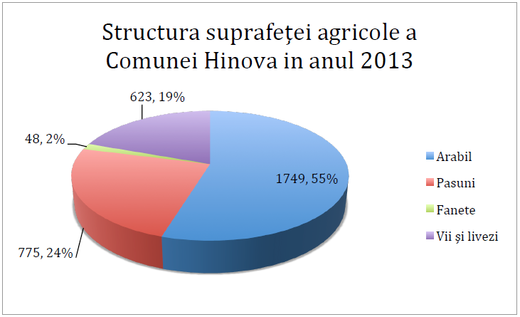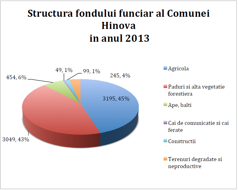 Comuna Hinova are o suprafață agricolă medie, reprezentând aproximativ 42% din suprafața administrativă. Terenurile împădurite, respectiv pădurile, ocupă o suprafață de 3049 ha, reprezentând 43% din suprafața totală a comunei.